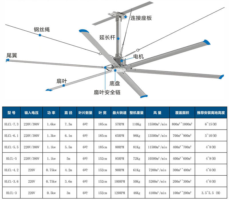 風葉直徑通常為 3、6米至7、3米,能夠覆蓋大面積區(qū)域,風速為 1-3米/秒,提供舒適的微風效果。